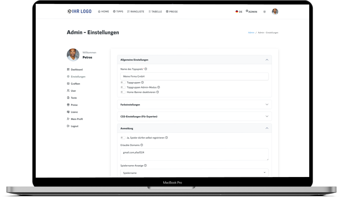 Für Unternehmen: Sie haben die volle Kontrolle über Ihre WM 2026 Tippspiel Software. Passen Sie sie komplett an Ihr Corporate Design an – vom Firmenlogo über Farben und Texte bis hin zu individuellen Features. Ideal für Team-Building-Maßnahmen und Marketing-Kampagnen.