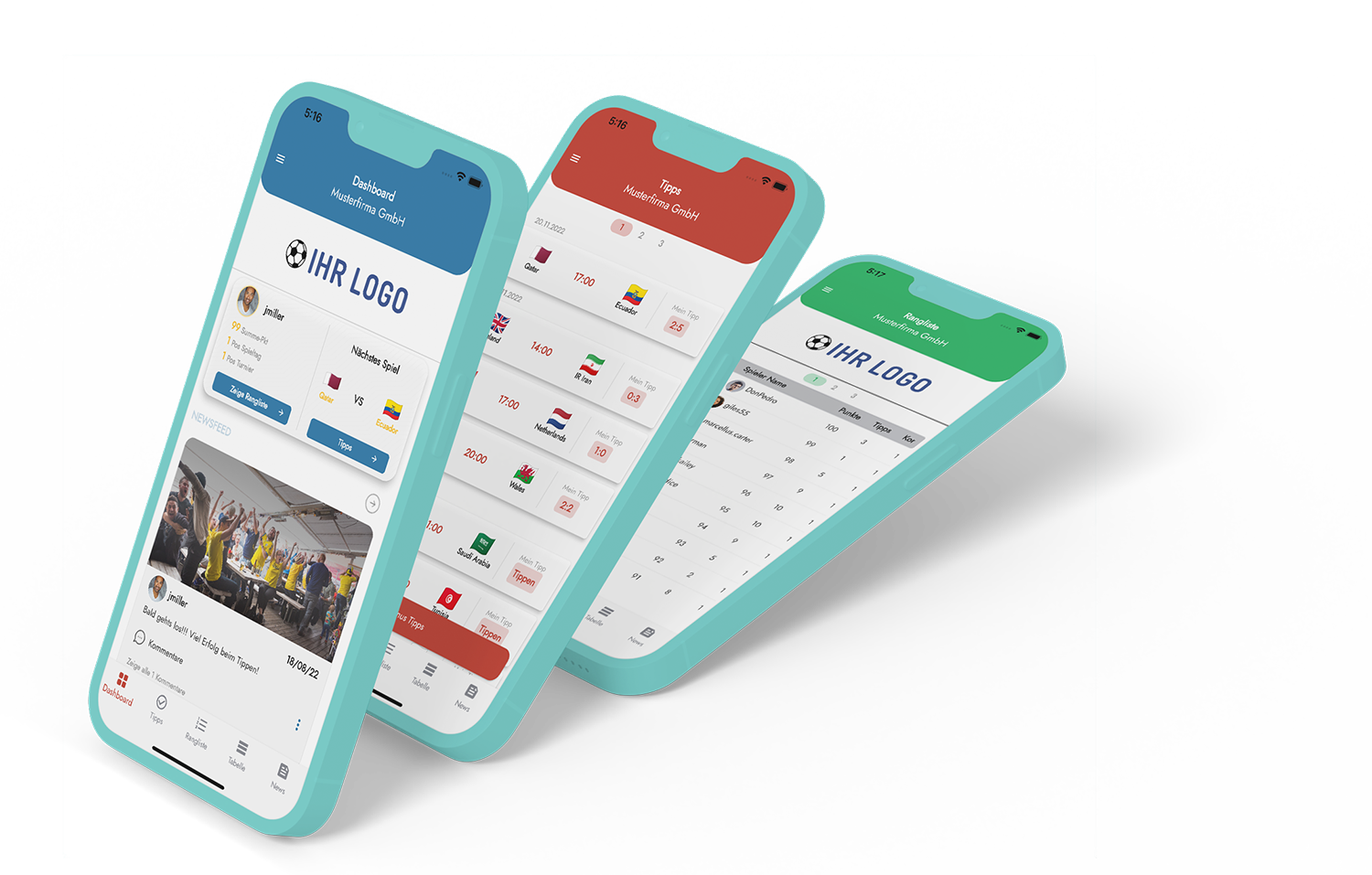 Für Unternehmen: Mit unseren nativen Apps für iOS und Android können Ihre Mitarbeiter und Kunden während der WM 2026 bequem von überall am Tippspiel teilnehmen. Das Branding der App passen Sie im Admin-Bereich einfach an Ihr Corporate Design an – perfekt für Marketing-Kampagnen und Team-Building.