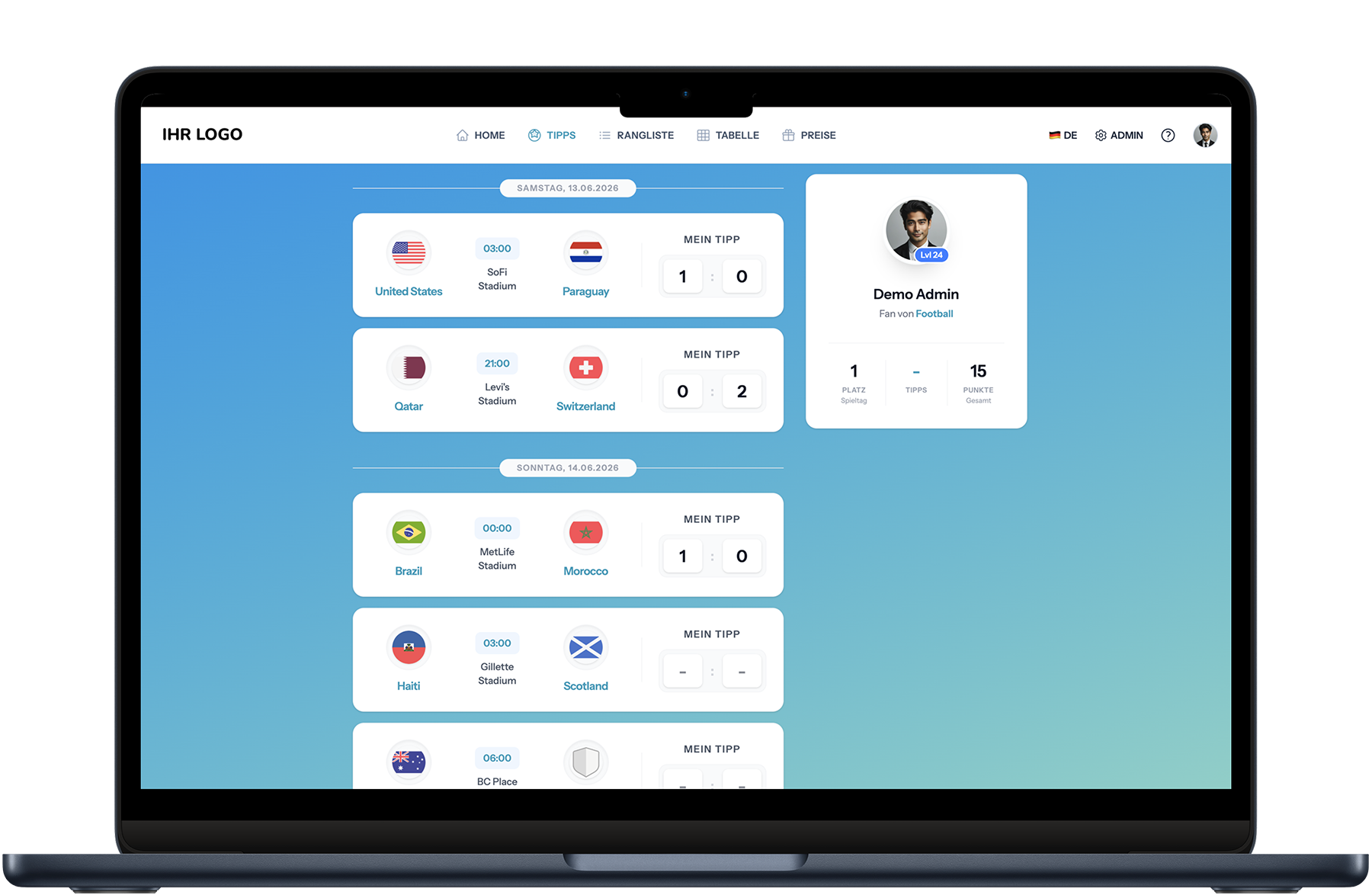 Unsere WM 2026 Tippspiel Software für Unternehmen bietet Firmen alle Funktionen für ein professionelles Corporate Tippspiel: